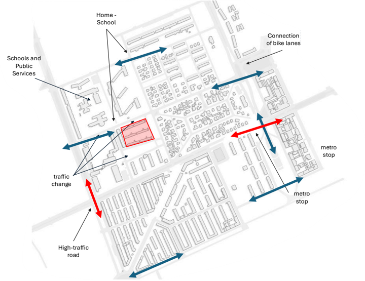 The neighbourhood exhibits positive social dynamics and active community engagement, bolstered by municipal projects that include new libraries, improved green spaces, and the introduction of a Metro 4-line stop, enhancing connectivity and social activities. However, challenges remain, such as the diverse origins of the population and urban decay resulting from inadequate building maintenance and a lack of green spaces.