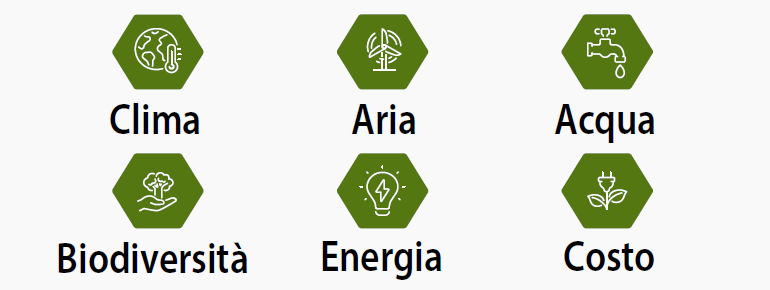 Il software Greenpass consente di analizzare la resilienza degli edifici ai cambiamenti climatici e di simulare l’efficacia delle NBS attraverso 6 sfide urbane: Clima, Aria, Acqua, Biodiversità, Energia, Costo.