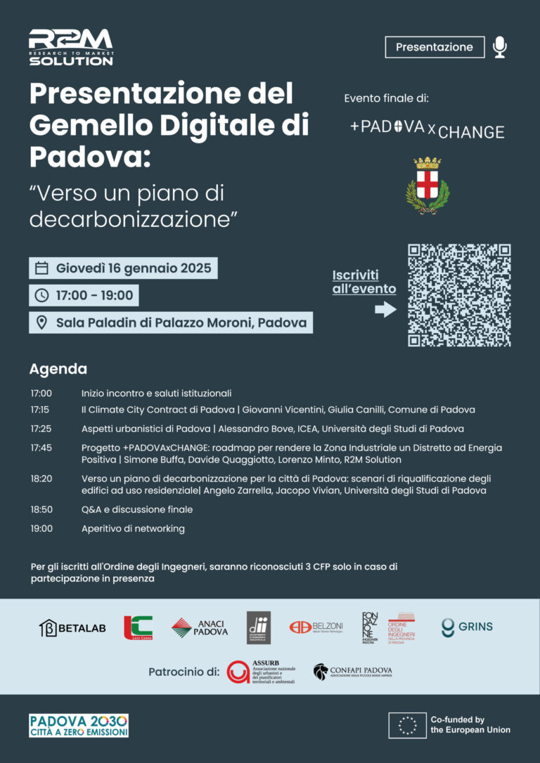 Oltre alla presentazione del Gemello Digitale da parte di Simone Buffa e Davide Quaggiotto di R2M Solution, l’evento ha visto coinvolti Giovanni Vicentini, Giulia Canilli, del Comune di Padova per illustrare il piano di transizione verde della città elaborato all’interno del Climate City Contract del progetto Net Zero City Mission. Alessandro Bove, Angelo Zarrella, Jacopo Vivian dell’Università degli Studi di Padova hanno presentato gli scenari di decarbonizzazione degli edifici ad uso residenziale e gli specifici aspetti urbanistici di Padova che determineranno una roadmap di decarbonizzazione basata sulle caratteristiche della città.