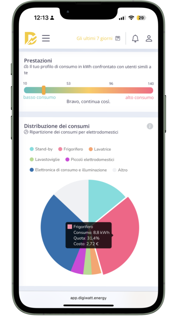 Digiwatt Home confronta i tuoi consumi con quelli di utenti simili e ti suggerisce come migliorare, incluso quanto potresti risparmiare cambiando comportamento.