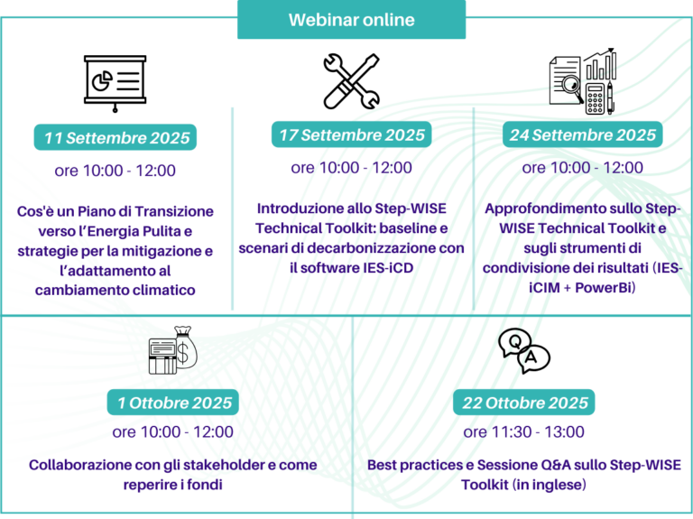 Il progetto propone un ciclo di webinar gratuiti rivolti a enti pubblici e consulenti energetici, per accompagnarli passo dopo passo dalla costruzione della baseline energetica alla definizione di scenari di decarbonizzazione, fino al reperimento dei fondi e al coinvolgimento degli stakeholder.